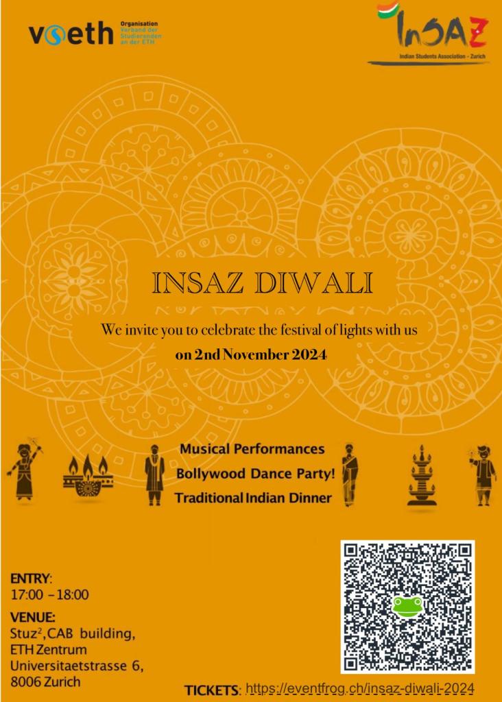 We kindly invite you to our flagship event: InSAZ Diwali on Saturday, 2nd November 2024 at Stuz2, CAB, ETH Zurich (Zentrum). There will be several cultural performances, a 3-course Indian buffet followed by an epic Bollywood DJ party.